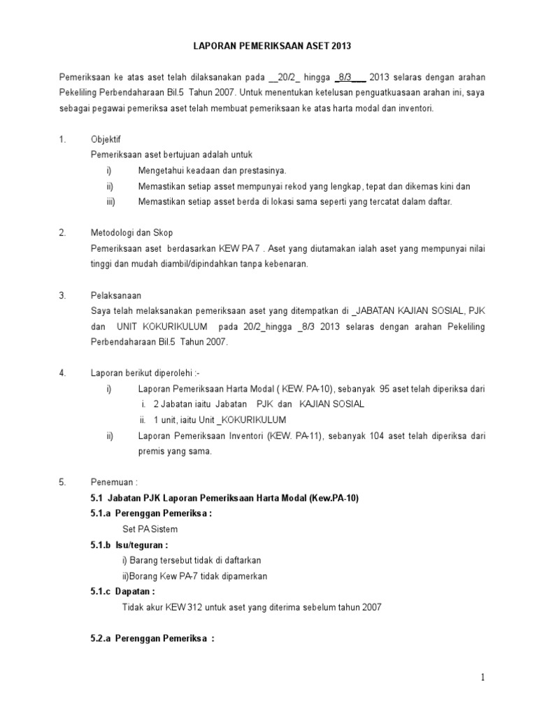 Demikianlah beberapa ulasan artikel tentang contoh laporan pemeriksaan aset yang dapat Anda jadikan referensi untuk mengetahui lebih jauh mengenai contoh laporan pemeriksaan aset. 93 UPA Jabatan Ibu Pejabat hendaklah menyenaraikan semua PTJ dan. 37 Full PDFs related to this paper.